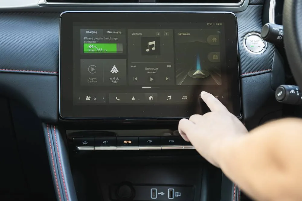 The exterior is a clever mélange of styles we’ve already seen on other brands, and that’s fine by me. The cabin is festooned in man-made finishes, with no cows harmed in the creation of the car. The driver has a digital display, with another LCD screen on the centre console.