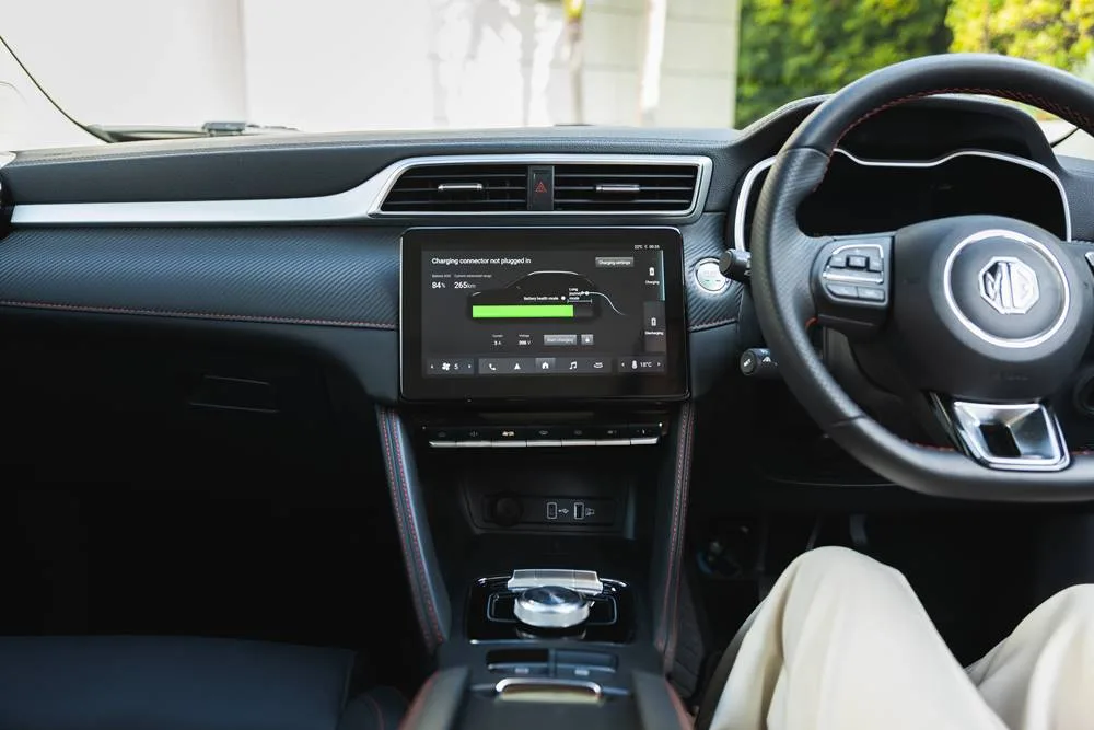 It comes with a 72.6 kWh battery which takes about an hour to charge from a 50kw (max) public charger, or overnight at home. The standard MG ZS EV has a battery of around 52kWh, so apart from a larger battery, range is extended even more by wound power back just a tad, from 130kw to 115kw/280Nm. You can expect 440km of whispering, gloat-worthy range, floating along on a carpet of smugness.