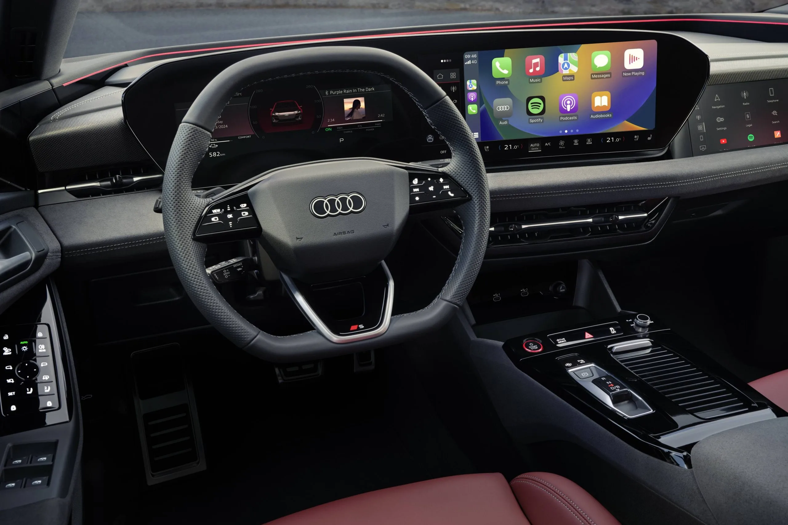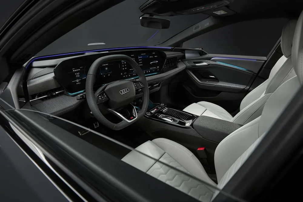 The front has slim daytime running lights and a wide grille giving the car a flat, wide look. A black mask is a nod to the e-tron design language, making the main headlights and other elements look cohesive.