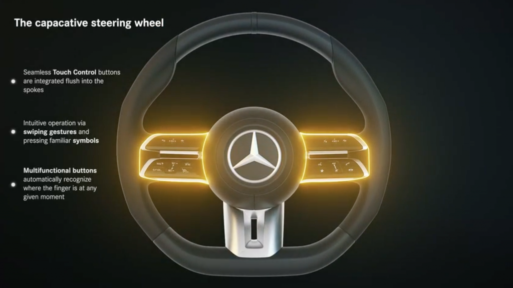 The high-quality materials have been selected so that operation is not impaired even in an interior heated by sunlight.The operating surfaces for the instrument cluster and media display, which are flush with the spokes, are designed to withstand temperatures of over 100 degrees Celsius (212 degrees Fahrenheit). For the first time, the individual Touch Control buttons are completely and seamlessly separated from one another and operate with digital signals. The mechanics of the buttons are thus reduced to an absolute minimum. The touches are recorded and evaluated by capacitive sensors, enabling intuitive operation via swiping gestures and pressing the familiar symbols. The system automatically detects where the finger is located.