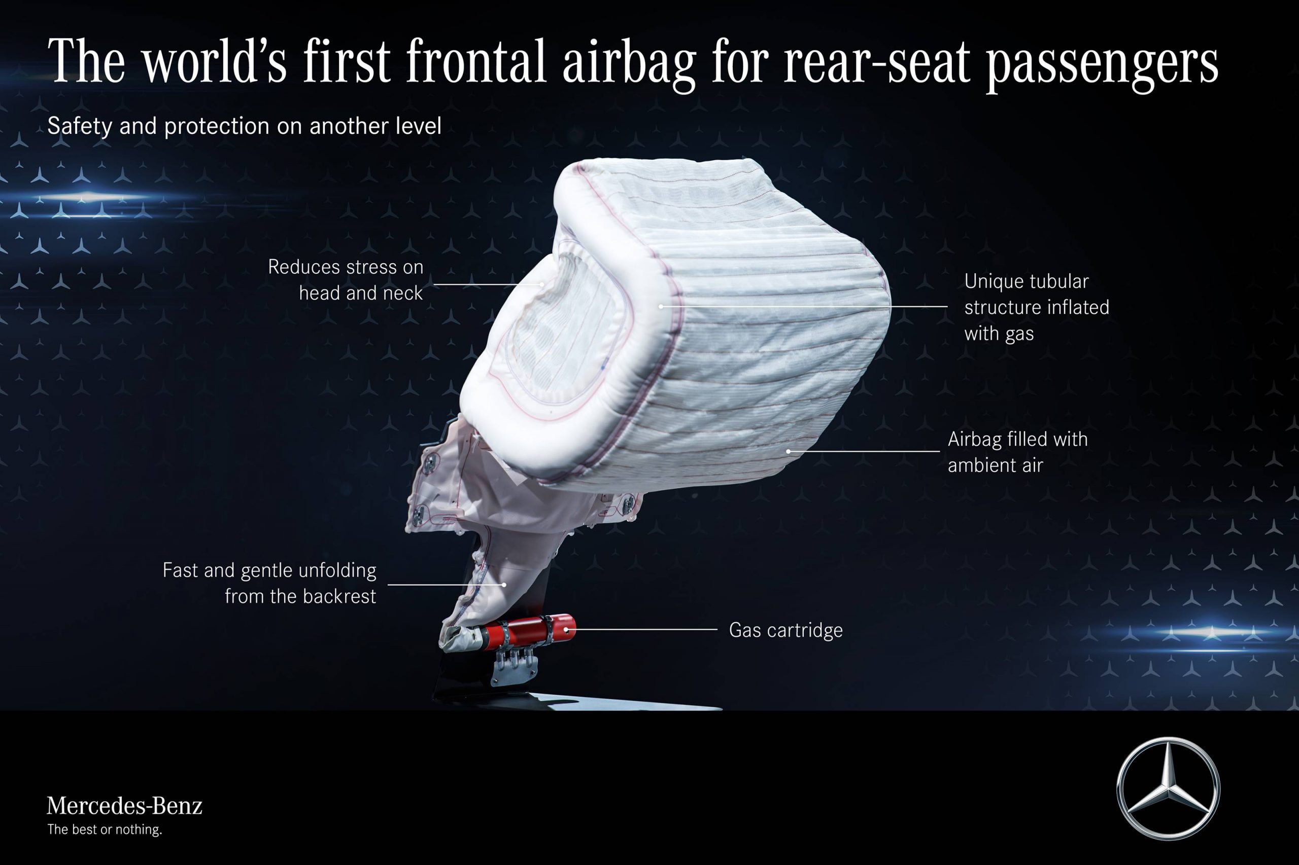 40 years later: The 223 model series S-Class, which debuted in 2020, includes additional new airbags such as the rear airbags, which celebrated their world premiere this year. 40 years after the launch of the first ever driver’s airbag, this new rear airbag uses a radically new inflation concept with a tubular structure, designed to deploy frontal airbags for both outer rear seats for the very first time. In the event of severe head-on collisions, this innovation considerably reduce the load on the head and neck of passengers restrained by seat belts in these seats.