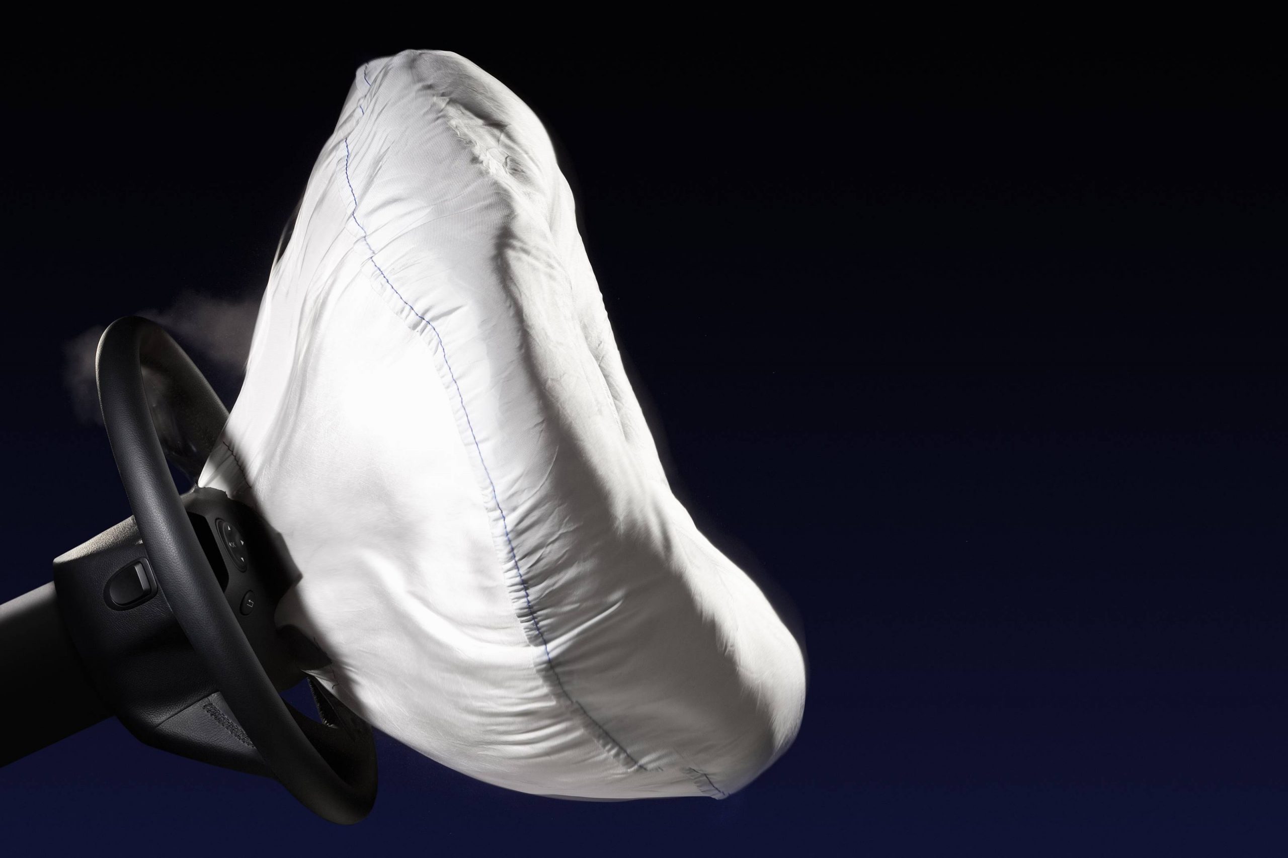 Minimizing the impact: The protective airbag inflates within a few milliseconds in front of the occupants. Sensors detect a particularly strong deceleration, for example sudden braking in a severe head-on collision, and trigger the firing of a propellant charge. The resulting gas mixture, which at the time of the airbag’s invention mainly consisted of nitrogen, inflates a cushion-shaped fabric cover – the airbag. It offers the best possible protection in combination with the seat belt, both deployed to gently cushion the upper body when it is thrown forward by the impact.