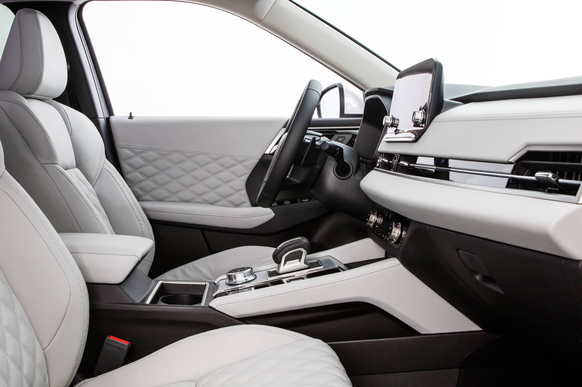 The design concept of the all-new Outlander is “Bold Stride”, representing a bold, adventurous attitude and confidence to move forward. The strong, horizontal-themed proportion from front to rear, the contrast of broad and powerful surface and character lines with sharp edges, as well as the large-diameter 20-inch wheels and overhanging fenders that emphasize the wide body express a bold aura and a sense of presence and stability.