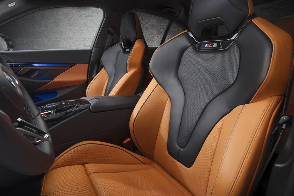 Inside, the BMW M5 continues its tradition of high-performance luxury. Features includes Merino leather trim, a new flat-bottomed steering wheel, a BMW Interaction Bar, and ambient lighting with M-specific interior themes, including Welcome and Goodbye Animations. BMW iDrive 8.5 commands the control and connectivity. A model-specific control panel on the center console allows drivers to customize their driving experience, including configuring the drive system, transmission, chassis, steering, braking, and M xDrive settings. Different M HYBRID modes can also be selected via this interface.