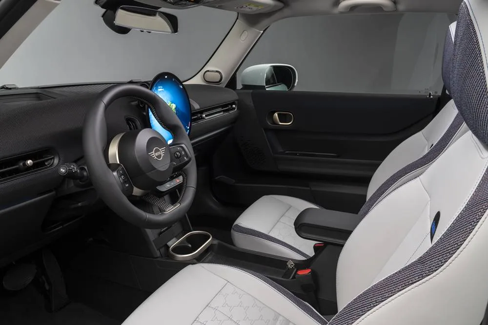 The wireless charging, retro controls, and “Hey Mini” assistant make the minimal interior function without being festooned with clutter.
