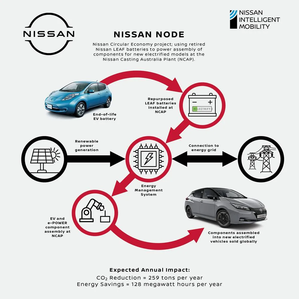 Nissan will use end-of-life electric vehicle batteries in the Nissan Node project, using a solar array installed at Nissan Casting Australia, as well as new EV chargers.