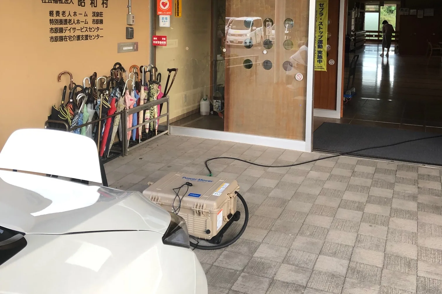 In the wake of Typhoon Hagibis, those working at the centre have found an unexpected way to plug in: the white Nissan LEAF parked outside.
