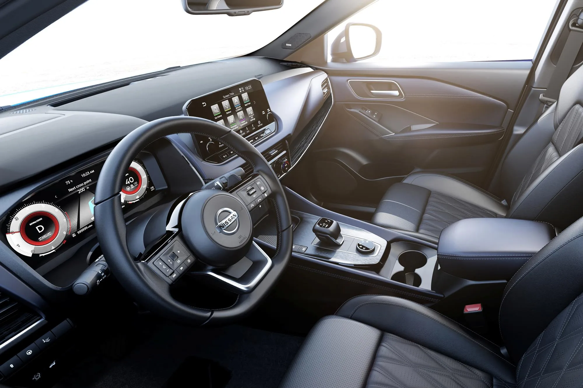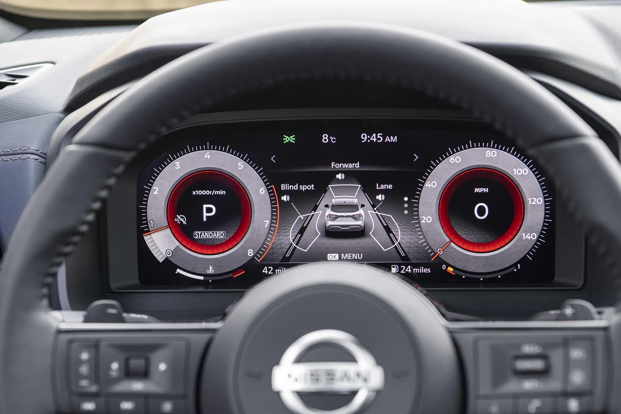 A new high-definition, fully electronic 12.3 inch TFT multi-information screen offers a choice of configurable layouts to display navigation, entertainment, traffic or vehicle information, all controlled from a new tactile dial switch on the steering wheel. A traditional “Kiriko” cut glass texture is also added to the TFT’s digital background – a nod to Nissan’s Japanese DNA.
