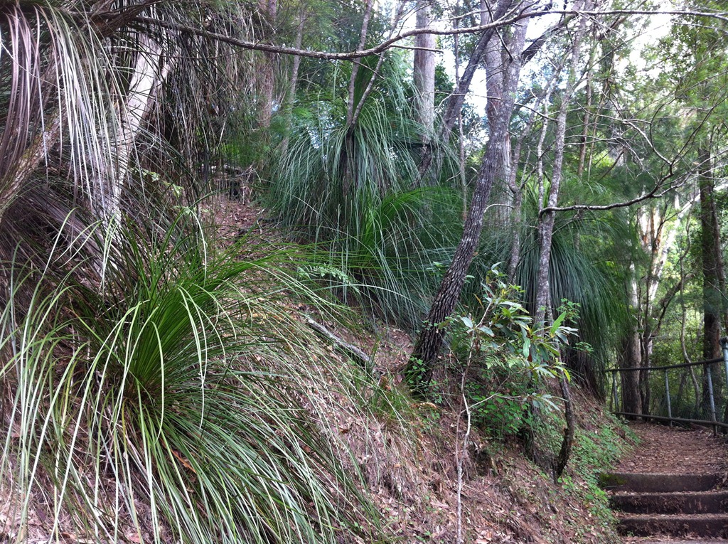 Short walk down a hill from the carpark to the entrance to the walk. Passed a cheeky Kooka who was making a meal of worms. How did he see them?