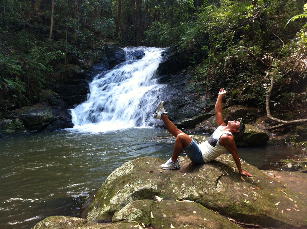 The walk varies between rain forest and dodgy narrow steps. In parts the edge steeply drops hundreds of metres. It’s warm and sticky so the first pool looked mighty fine. It’s like a movie set with the water glowing from a shaft of light through the thick overhead canopy.