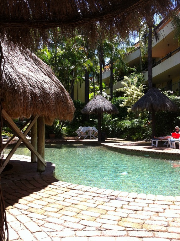 Looking down from our balcony to one of the pools whose water is sparling like diamonds. The little spa nearby has its own thatch-roofed cabana . I’ve spent a lot of time there. It’s funny, the hustle of Sydney seems so far behind, I don’t want to go back.