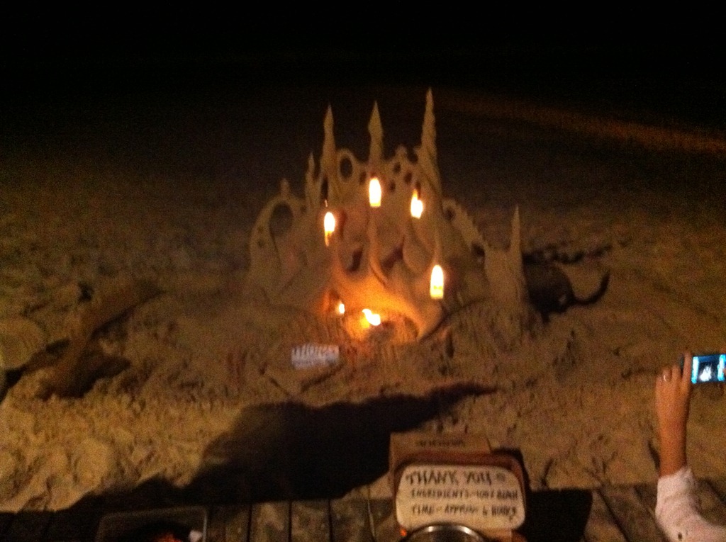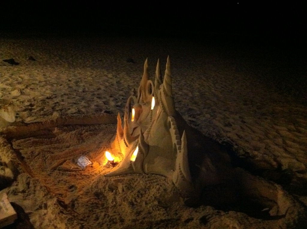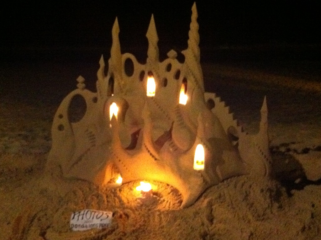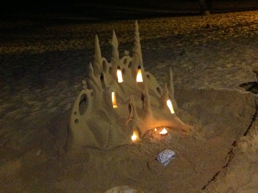 NOTE:- Last night went down the hill for dinner. There is a surf comp in tow so the place is heaving. There were waits at all the food joints. I thought a place on the beach might have been nice to take the parents for like everywhere else there was at least a half hour wait. It didn’t worry me but the InLaws and the Gen Y brother want everything NOW. We went through a small arcade onto the boardwalk and came upon the most marvellous sandcastle. It must have taken hours to construct and was lit by several spirit burners. I’ve never seen anything as wondrous. The note said “please take a photo. A donation is most welcome.” I emptied my coin purse into the container. Here’s why: