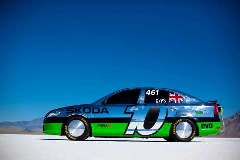 A ŠKODA is now the fastest production car in the world, sporting a charged engine with a 2 litre displacement. At 365 kilometers per hour or 227.07 miles per hour, the Octavia vRS Bonneville Special model achieved the new record in the course of high-speed drives in the American salt desert at Bonneville in the U.S. state of Utah. Only a few days after the vehicle had exceeded the 200 mile speed threshold on the same track, the 600 hp strong ŠKODA racer reached the new record on 19 August, 2011, at 7:45 a.m. local time. The occasion for the drives was the ten year anniversary of the ŠKODA vRS models.
