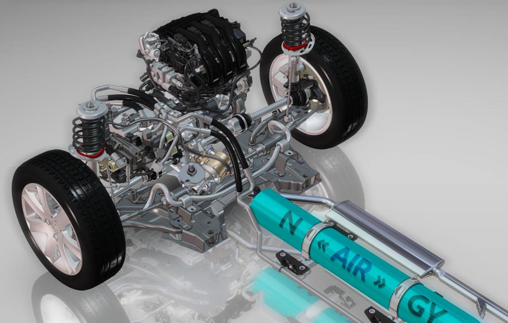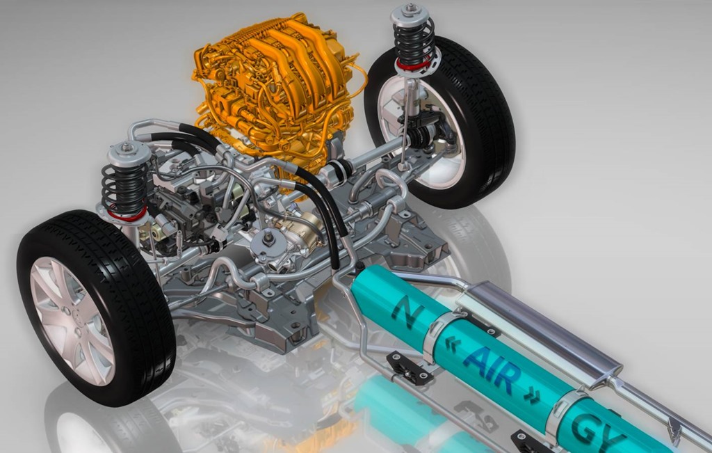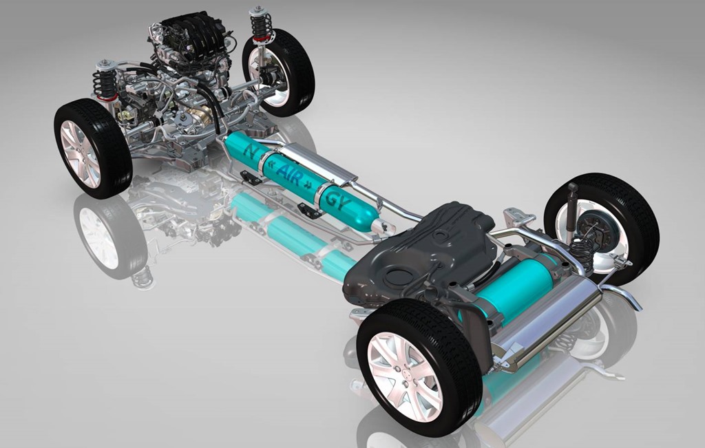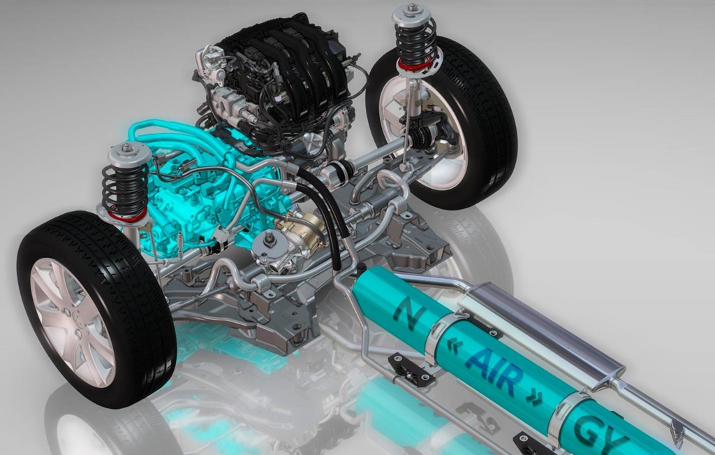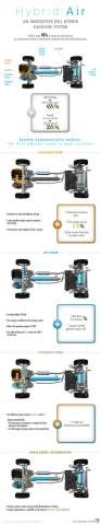 Hybrid Air is a completely new petrol/compressed air technology for a battery less full-hybrid powertrain. The system comprises a petrol engine, a compressed air energy storage unit, a hydraulic pump/motor unit and an automatic transmission.