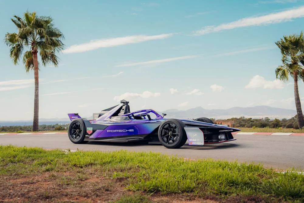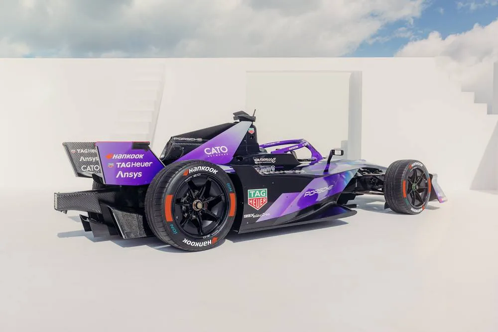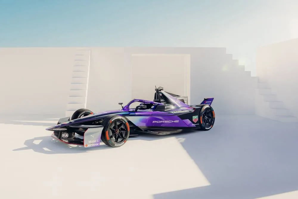 The Porsche 99X Electric features a striking new color scheme in Purple Sky Metallic and Shade Green Metallic, reflecting Porsche’s technological advancements in both motorsport and production cars.