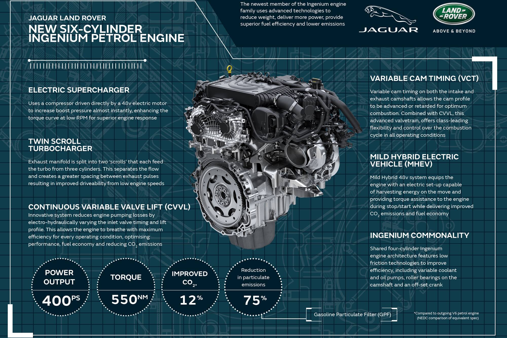 “In-line six-cylinder engines are inherently better balanced than V6 designs and our all-new Ingenium unit builds on that promise to optimise efficiency in all operating conditions. Advanced features, including an electric supercharger, ensure distinctive Range Rover Sport performance and responses, while the intelligent MHEV system harvests energy to improve fuel economy and reduce emissions.” Nick Rogers, Executive Director of Product Engineering, Jaguar Land Rover