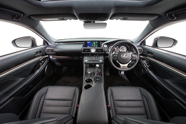 The engine might be getting on a bit, but it is willing and able. Through the smooth 8 speed auto, the RC is propelled to 100 in only 6.1 seconds. The auto has a torque converter which locks up between 2nd and 8th gears. That means there is no slippage in any gear but first giving the same economy as a manual. In fact you might even get a little better. In normal driving mode the Lexus makes sure the engine revs as low as possible and only changes down when power is needed. It does a better job of managing gears than a human could do if fuel consumption is the aim. Most of us won’t go higher than 4th around town meaning the 3.5 V6 would be screaming its head of most of the time on the dreary drive to work. The Auto will have none of it and changes up. Sports mode is a different kettle of fish altogether. The revs are kept up up up.