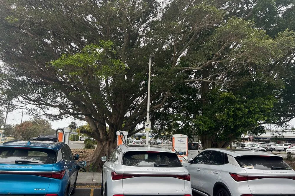 For the return journey I topped up in Ballina (photo). This was a chosen stop at Ballina Central Shopping area. They are tucked at one side near Maccas but behind a fence, so don’t drive into Macca’s carpark. It’s a nice spot near trees but no cover, as usual. I wandered in to get a coffee while the car charged. These chargers are part of the Chargefox network, 2 are superfast chargers. There were 3 Atto 3 cars lined up like ducks in a row. (photo)
