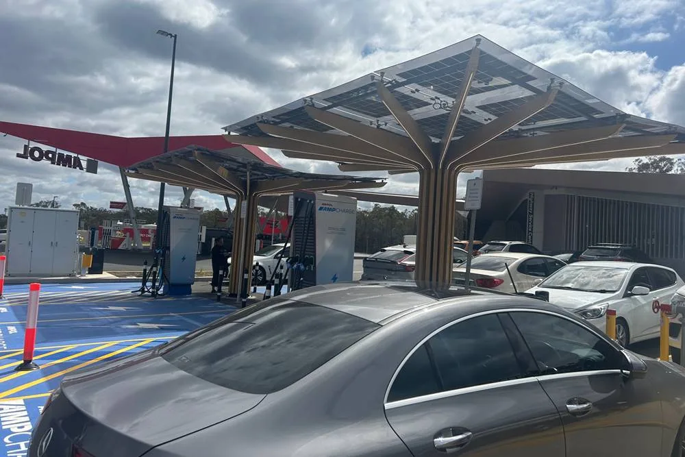 I frequently travel further south than Sydney. There is now, after extensive renovations, a new Ampol Roadhouse at Pheasants Nest on either side of the Hume Highway, and will you look at those mini solar covers! (photos)