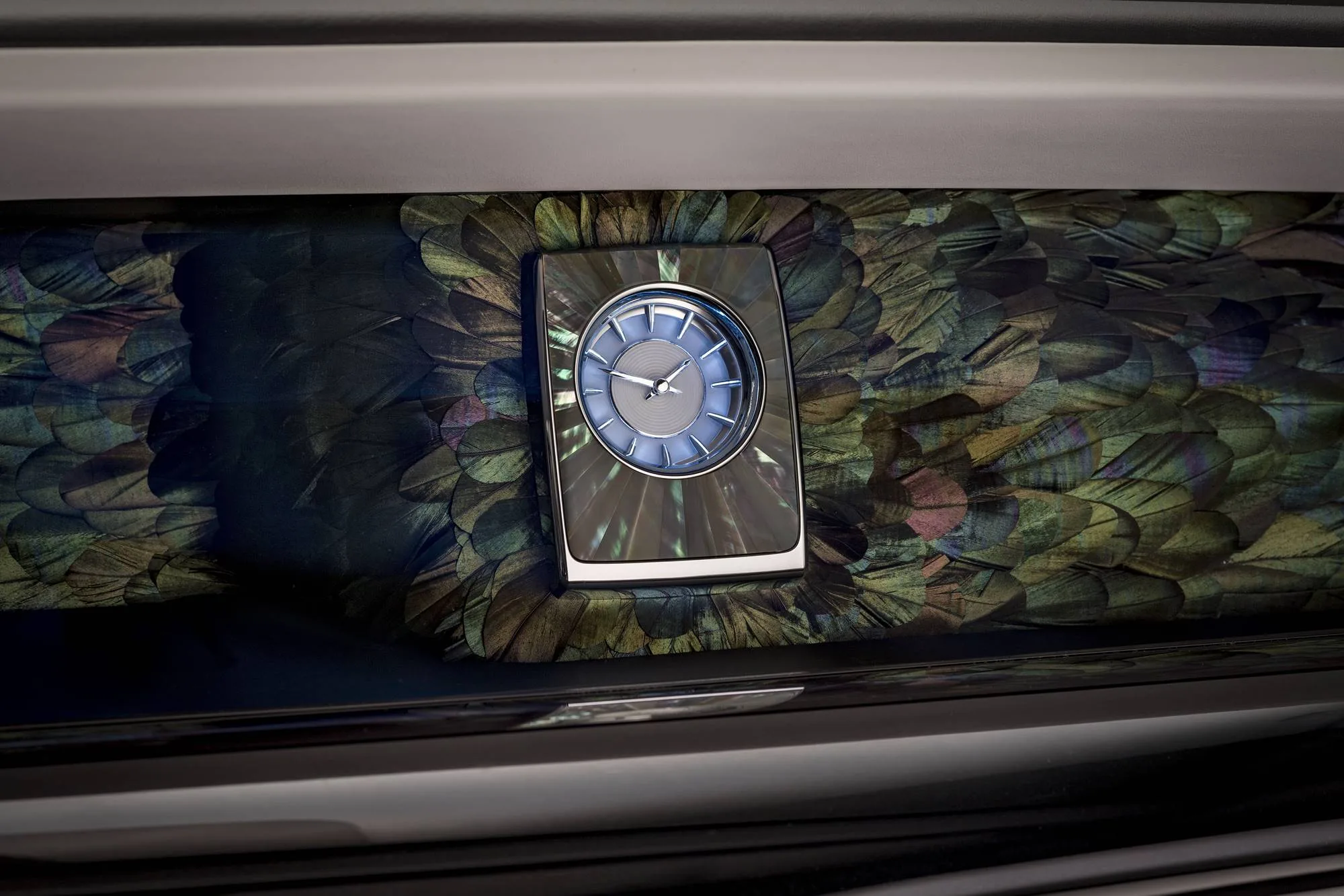 Mother of Pearl casing around the clock at the heart of the Gallery. The interior is completed with a Bespoke embroidery to the rear waterfall and silver inlays on the picnic tables.
