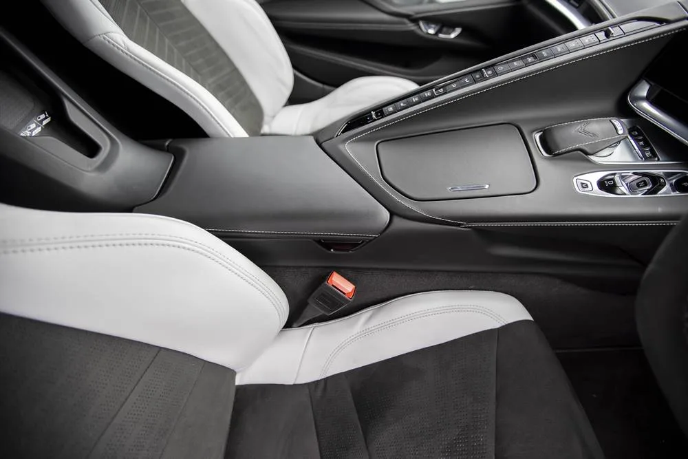 Ryan and I slipped into the Corvette after laying hands on its irresistible body. Like other supercars, the door handles form part of the bodywork and the electric latches are rubber pads, one under the left headlight, one in each door ahead of the engine intake, and another above the number plate. You can use the key fob but it is nowhere near as cool as sauntering up to the beast to slip a finger into a hidden crevice.