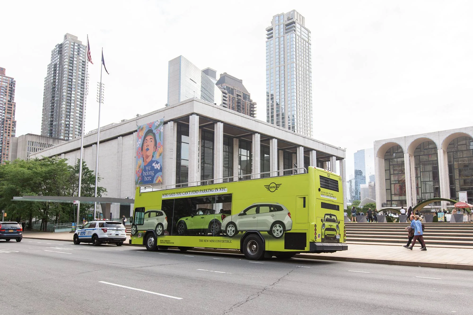 There is a Zesty Yellow bus with a large viewing window, and a caption reads, “who says you can’t get parking in New York.” It shows the Mini parked snuggly between two cars as a nod to the compact advantage of the little Brit. The bus is called “the Looking Glass” and will be making special guest appearances throughout the month.
