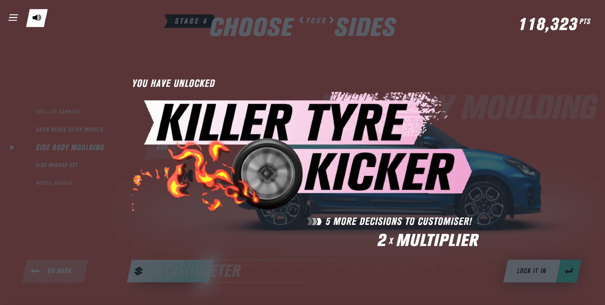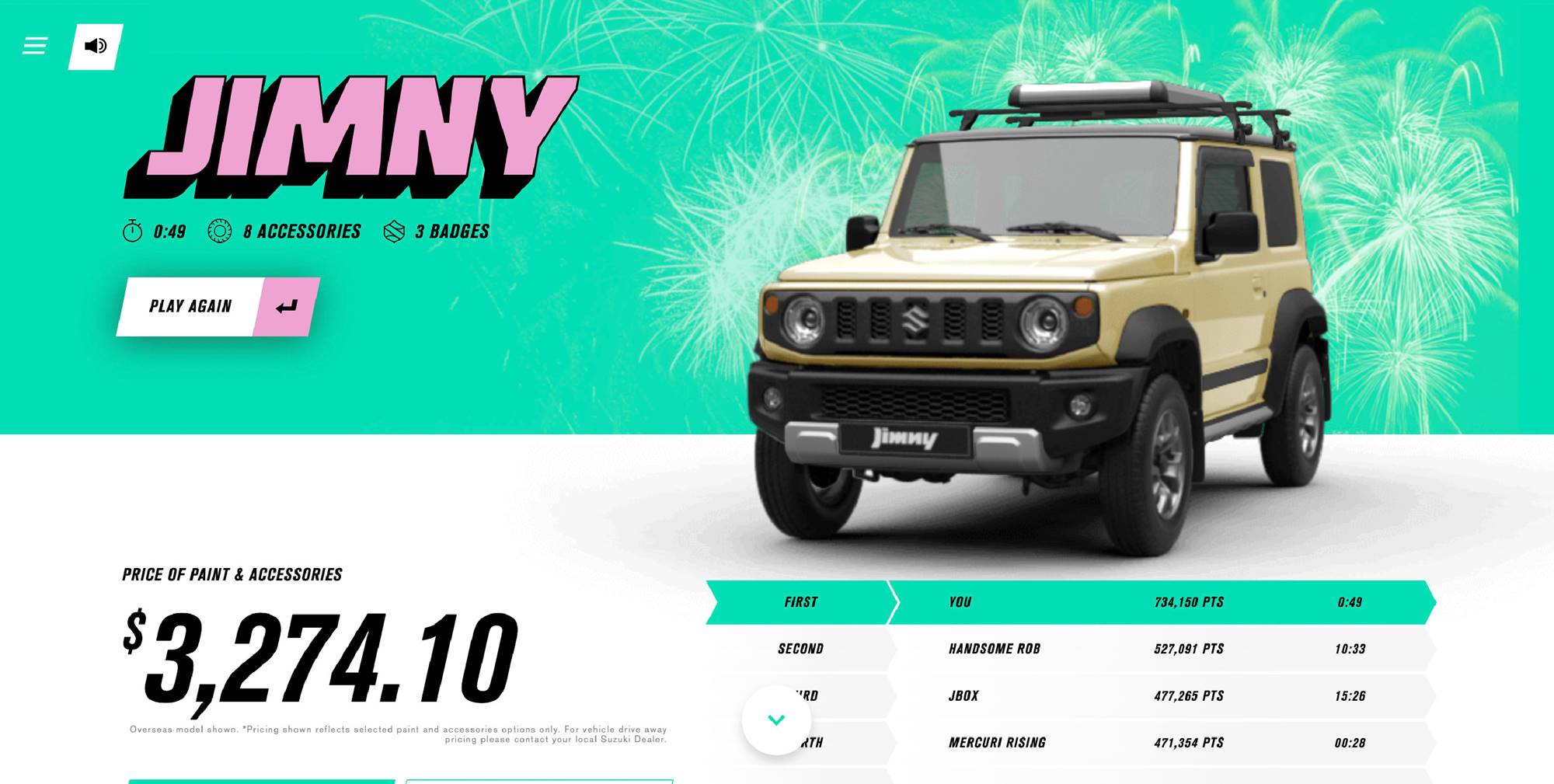 The program which is structured to mimic a game like format with a similar look and feel to popular console games like Gran Turismo or Forza is a game changer for showcasing Suzuki Accessories and further enhances the Suzuki customer experience online and in dealerships.