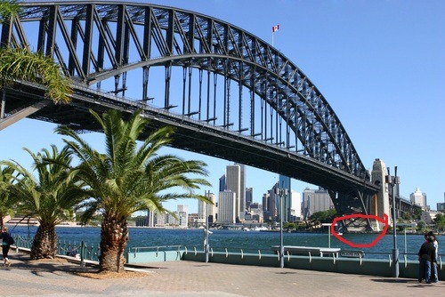 Here’s something you don’t see every day. Of course the blue thing is the Nissan 370z but are there any takers for what’s in the background? You’ll never guess in a million years. These two massive supports hold the huge pins that support the old Coat Hanger. here’s another shot during the way. You can see the far side of the bridge circled in red (BELOW) is where the massive weight of Sydney Harbour Bridge rests on two pins on either end of the bridge. The huge granite pylons DO NOT support any of the weight and are merely. Who knew?