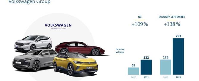 The Volkswagen Group continues is global electric offensive with big EV sale increases for the last ¼ of 2021. Despite a shortage of semiconductors, 122,100 BEVs were delivered in the July to September 1/4, an increase of 109 percent compared with the prior-year quarter.
