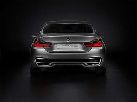 The sporting character of the BMW Concept 4 Series Coupe continues in the low-slung design of the rear. The prominent horizontal lines and stretched tail lights positioned at the outer edges of the rear draw extra attention to the muscular wheel arches and wide track. The design of the rear window has a lowering effect on the car’s tail and gives the body as a whole an even more powerful look. It also shows off the car’s broad shoulders with satisfying clarity. The horizontal lines of the rear end frame a subtle three-dimensionality, while a tightly structured concave indent in the rear creates shadowed surfaces and gives the car a forward-surging energy. This contrasting interplay of light and shadow brings extra vivacity to the rear end.