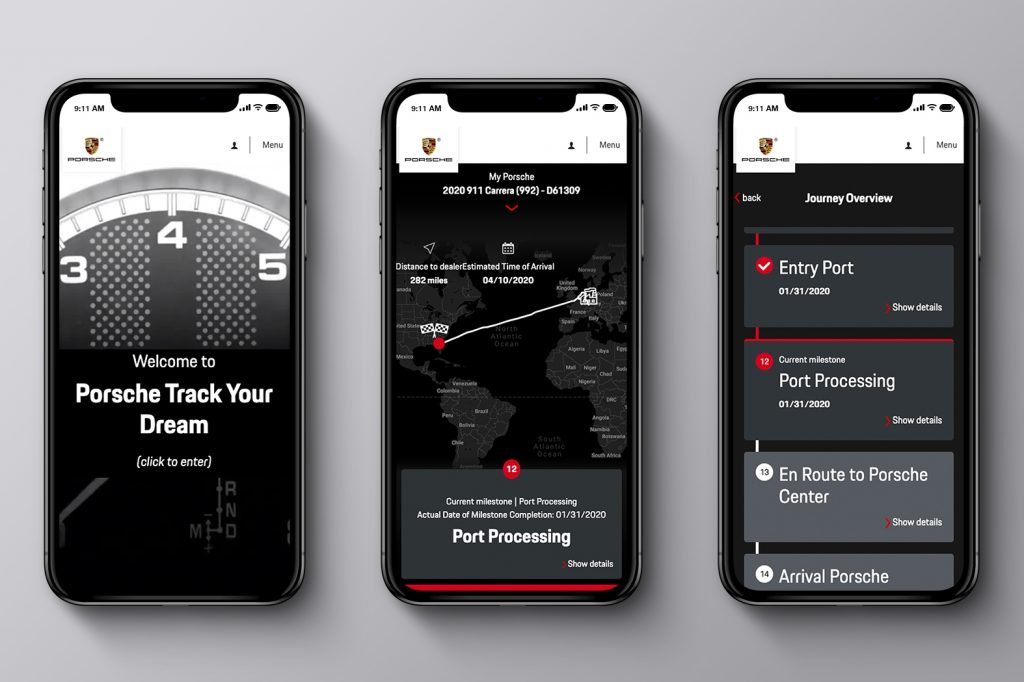 Porsche customers receive a unique link once their order is placed. This takes them to the online platform and lets them track their car through 14 milestone events. They include order creation, freeze point for vehicle changes, production updates, vessel departure from Germany, port entry into the U.S., dealership arrival and more. Background information about each milestone is available while a countdown shows the progress in miles and days.