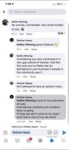 After being unfriended by members of that group, Hasan doubled down, saying gays not visiting his shop would not affect his income. However, yesterday afternoon, Hasan sent this message this to my inbox: