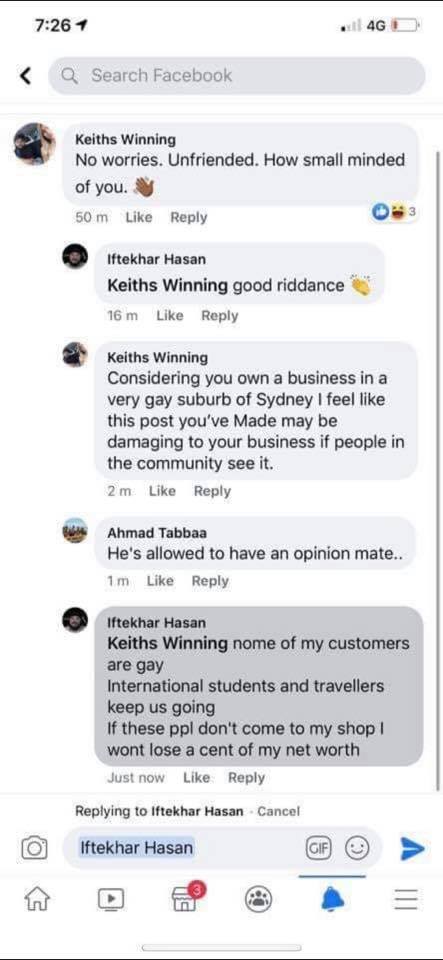 After being unfriended by members of that group, Hasan doubled down, saying gays not visiting his shop would not affect his income. However, yesterday afternoon, Hasan sent this message this to my inbox: