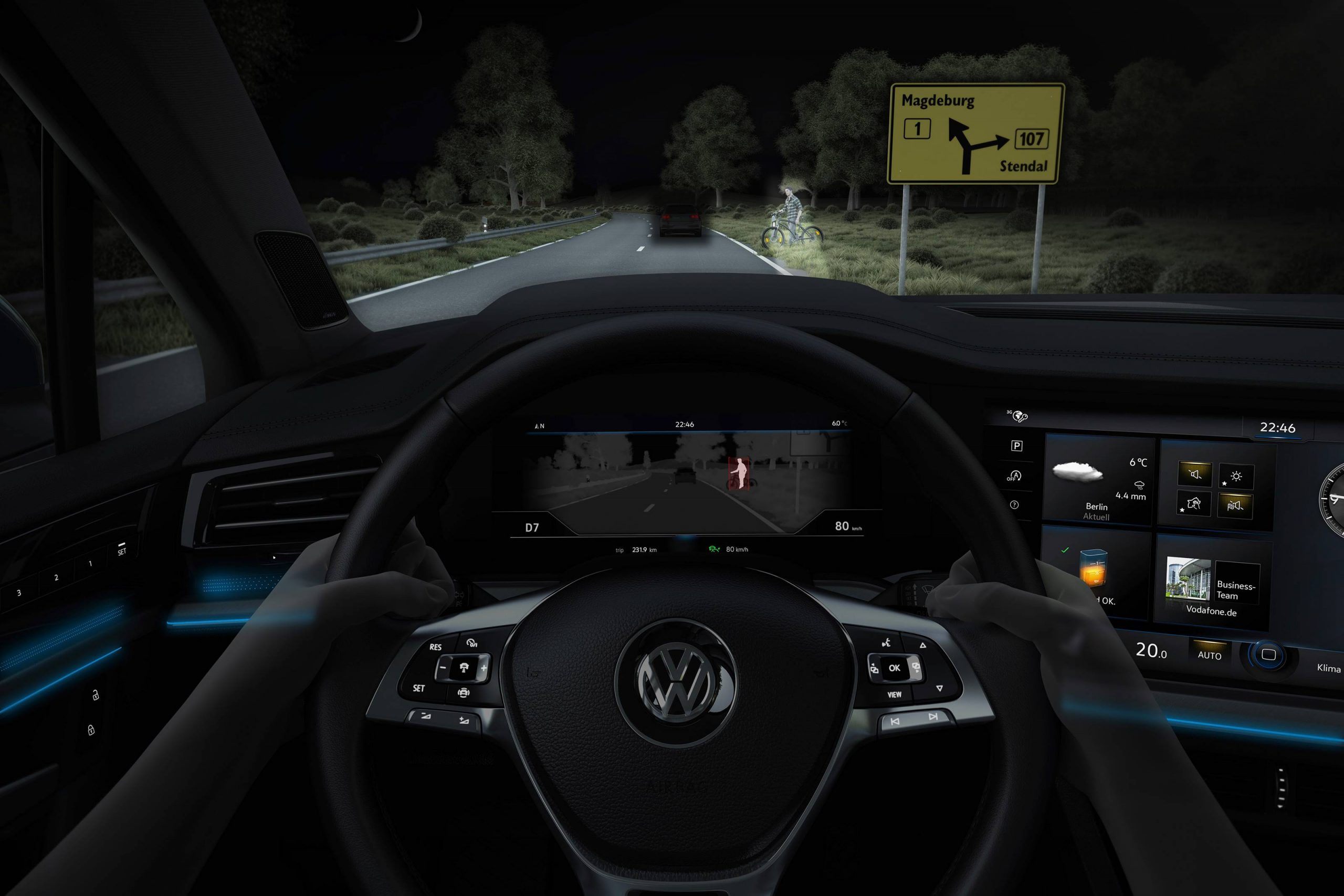 The night vision system is activated simultaneously with the Front Assist function. The warning time can be set parallel to that for Front Assist (early/medium/late) via the infotainment system. The contrast for the thermal image can be adjusted in the dash panel via the buttons on the multifunction steering wheel.