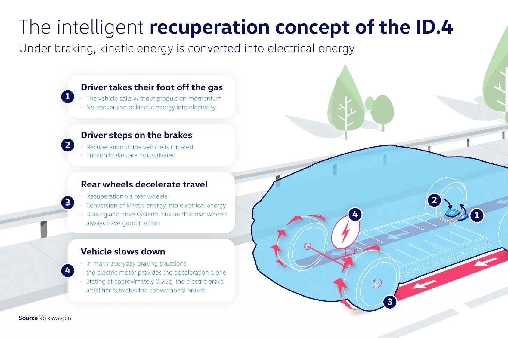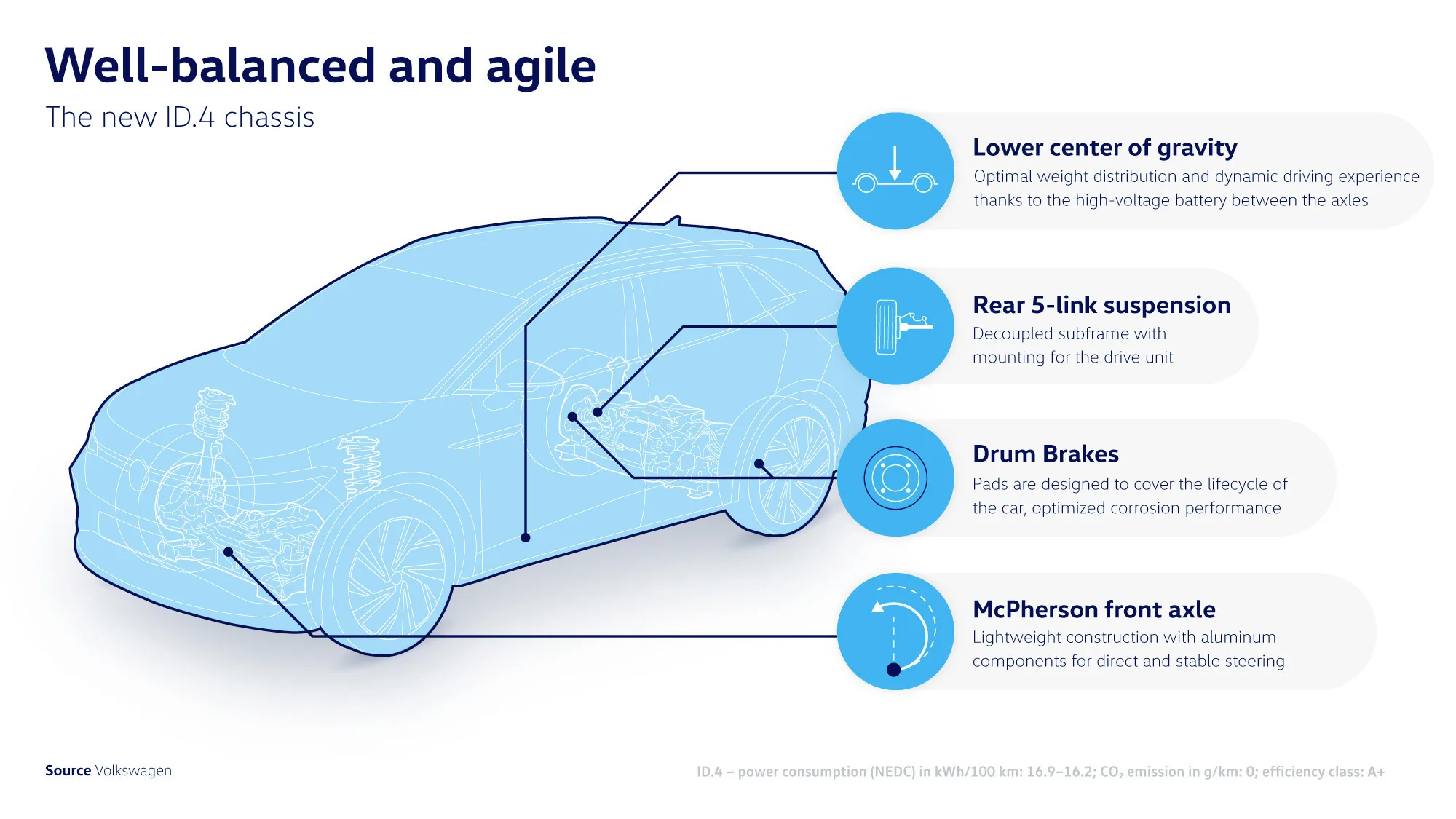 In both rear-wheel-drive, and AWD ID.4’s, the Vehicle Dynamics Manager works with other systems such as the Electronic Stability Control (ESC). It controls both motors, including the front motor when it is engaged. ID.4 has an XDS+ brake-based electronic differential to help when cornering at speed. it gently brakes the inside wheels to turn the car slightly into the bend, giving extra control and stability.