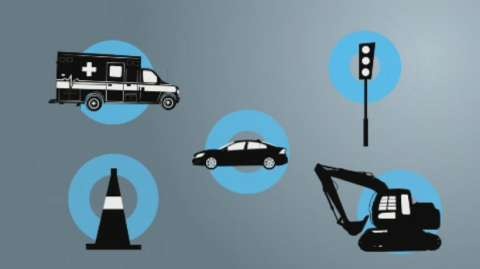 Alerts the driver to road works. Construction vehicles and heavy equipment can transmit information to vehicles well in advance of the site. Drivers can thus receive information about changed speed limits and altered routes near the work-site. The system can also keep the driver informed about the remaining distance before the end of the long road-work zone.