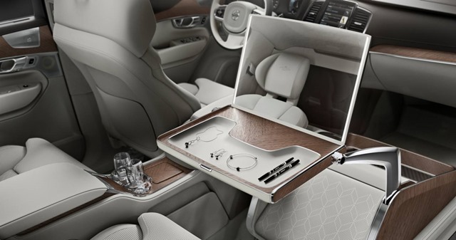 The Lounge Console incorporates features designed to enhance the in-car experience. Volvo Cars’ designers provide a large work table which opens to reveal an illuminated vanity mirror, including a storage tray for jewellery and personal accessories. The table rotates 90 degrees and simultaneously powers forward to display a large 17” media screen for a full in-car theatre experience. Below the cushioned leg rest is an additional area for shoes. For added security Volvo Cars has included a lockable storage box. The removal of the front passenger seat allows for full forward vision creating a uniquely spacious environment.
