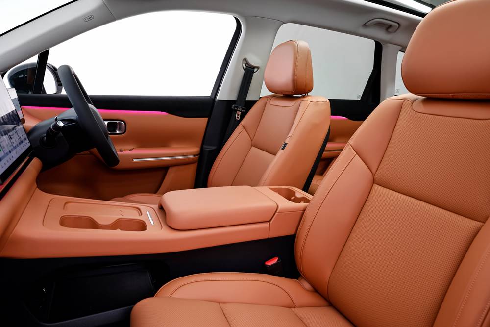 Inside, it punches well above its price tag. The cabin is enormous, especially in the rear, and the front seats are plush, heated, cooled, and wrapped in bold orange (sort of) silicon leather. It’s not subtle—like wrapping your lounge in Hermes—but it’s comfy and premium-feeling.
